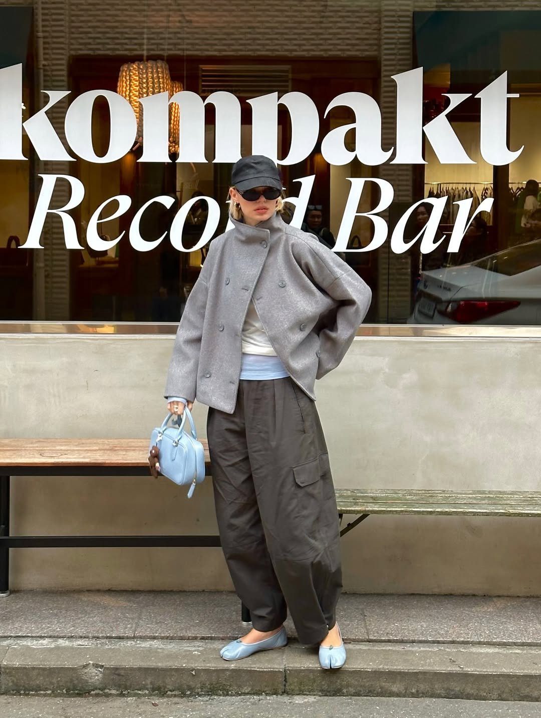 This outfit is all about structure and attitude. The oversized grey coat and loose trousers create a relaxed silhouette, while the small blue handbag adds just the right pop of personality.