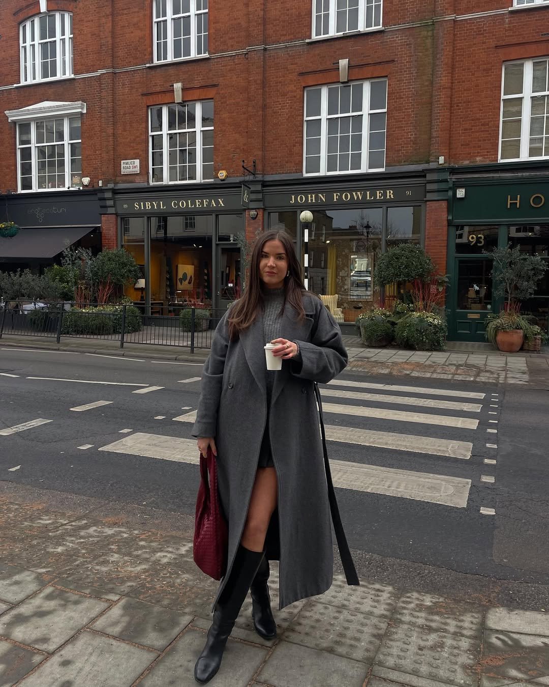 This outfit captures that perfect chilly-city-day energy. The long grey coat layered over knitwear and paired with tall boots makes the whole look feel warm and grounded.