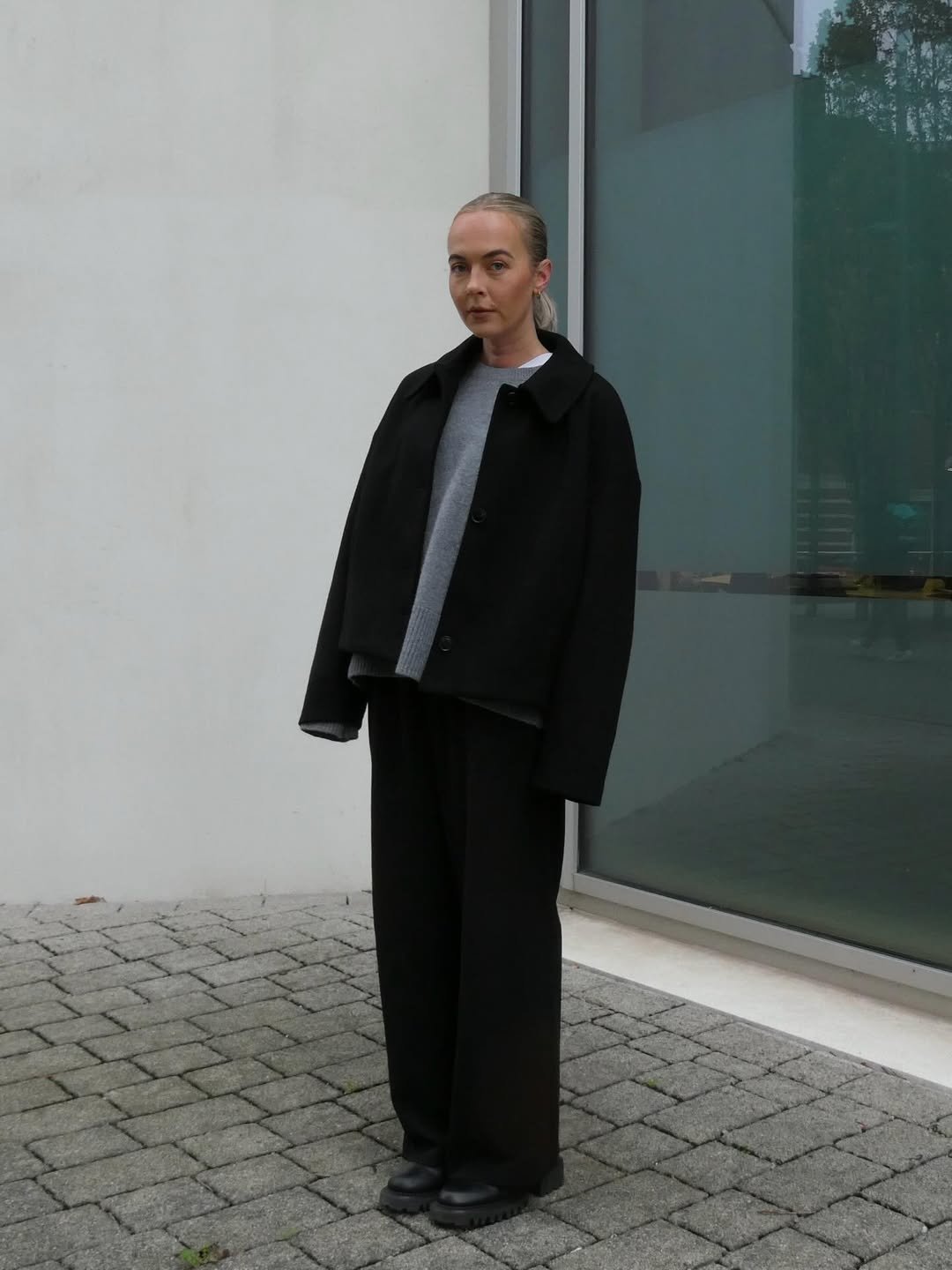 All-black outfits have a way of looking cool without trying too hard. The oversized jacket layered over soft grey and wide trousers gives this look a calm, minimalist energy.