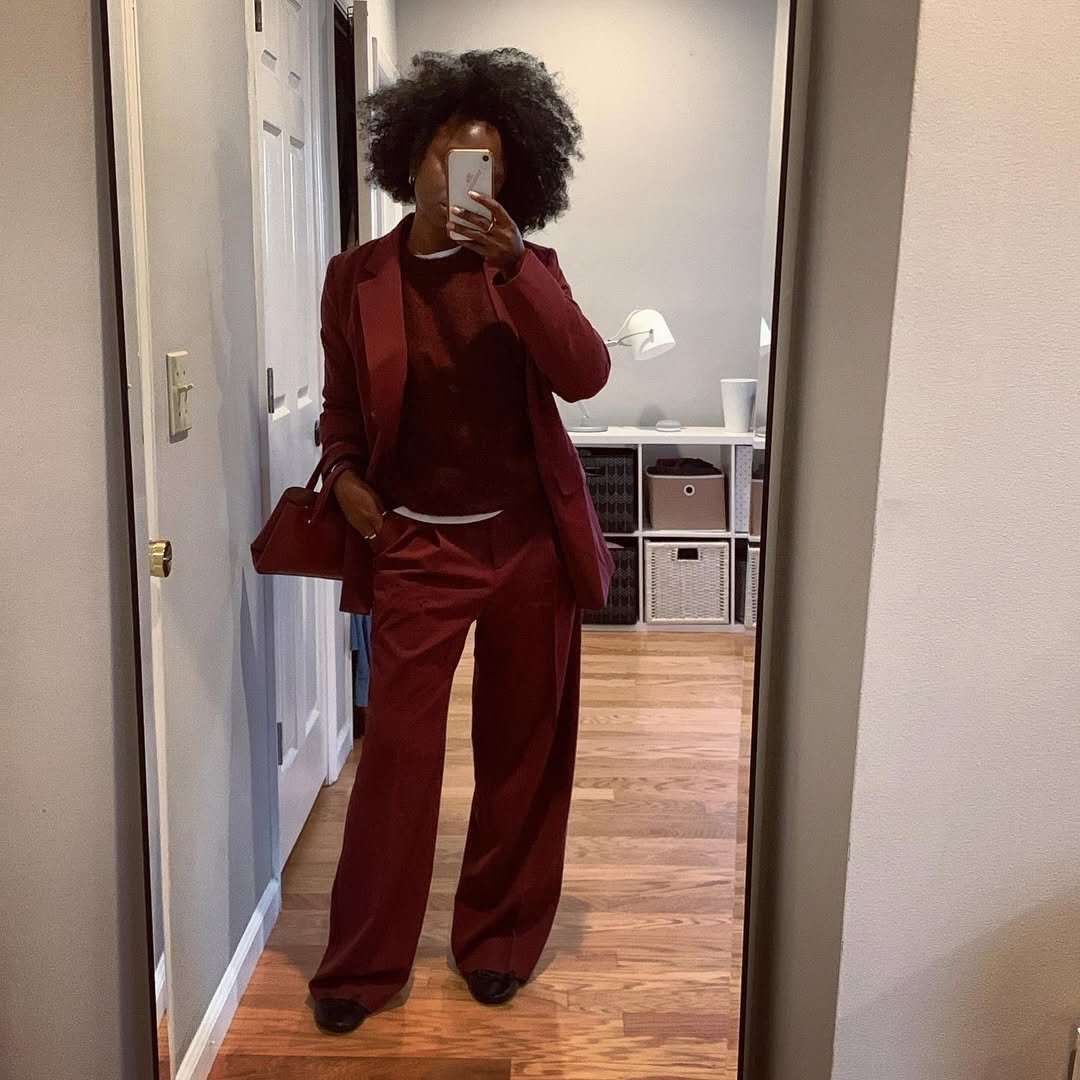 Even in a casual mirror shot, the outfit stands out. It’s bold without being loud, and the tonal layering makes the whole look feel intentional and sharp.