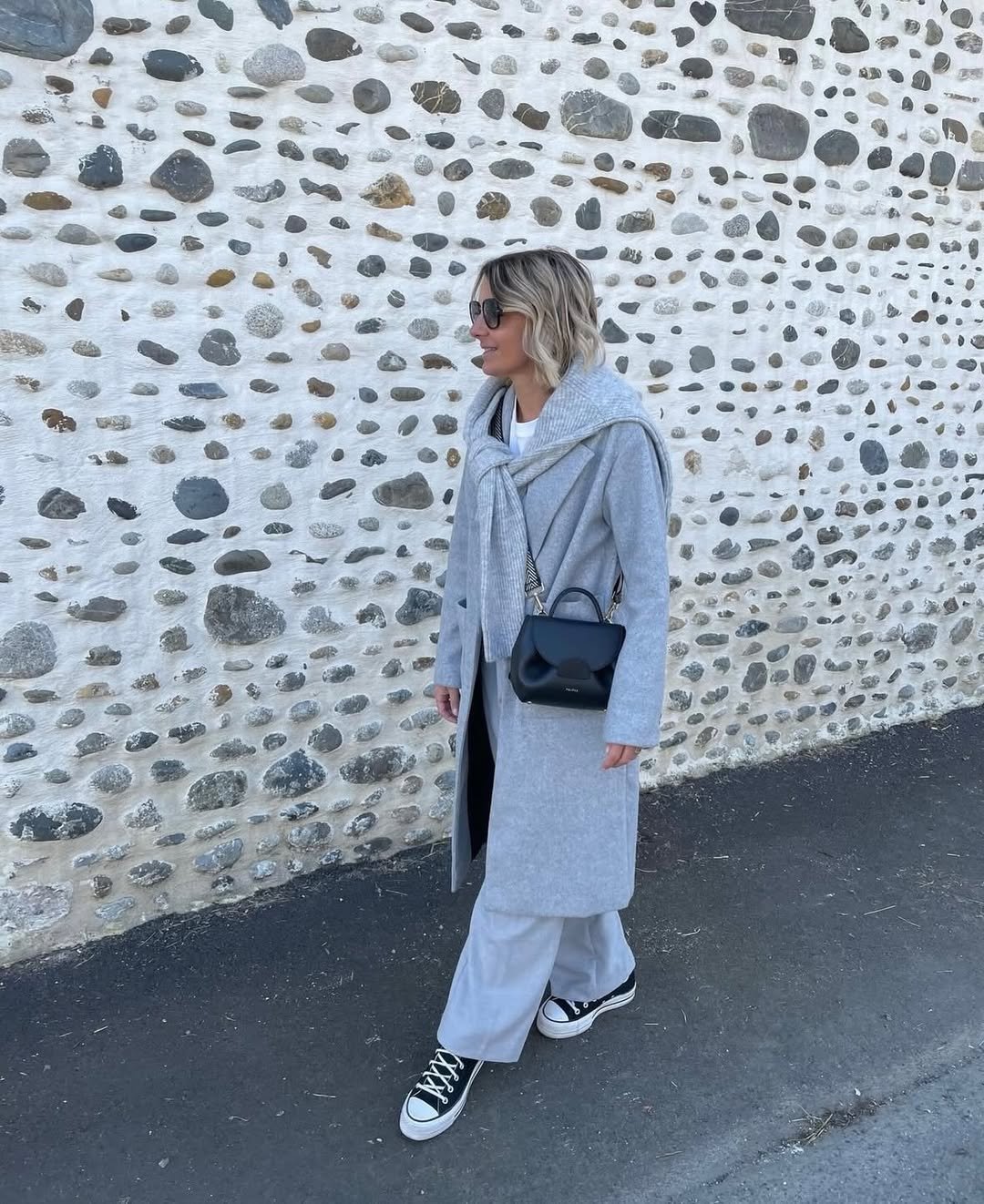 This outfit feels relaxed but still thoughtfully styled. The long grey coat paired with soft knit layers and casual sneakers makes monochrome feel approachable and wearable.