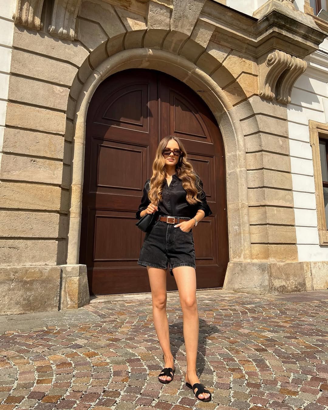 All-black in summer can be tricky, but this look makes it feel light and relaxed. The crisp black shirt tucked into denim shorts has that easy “I didn’t overthink this” vibe, while still looking completely put together.