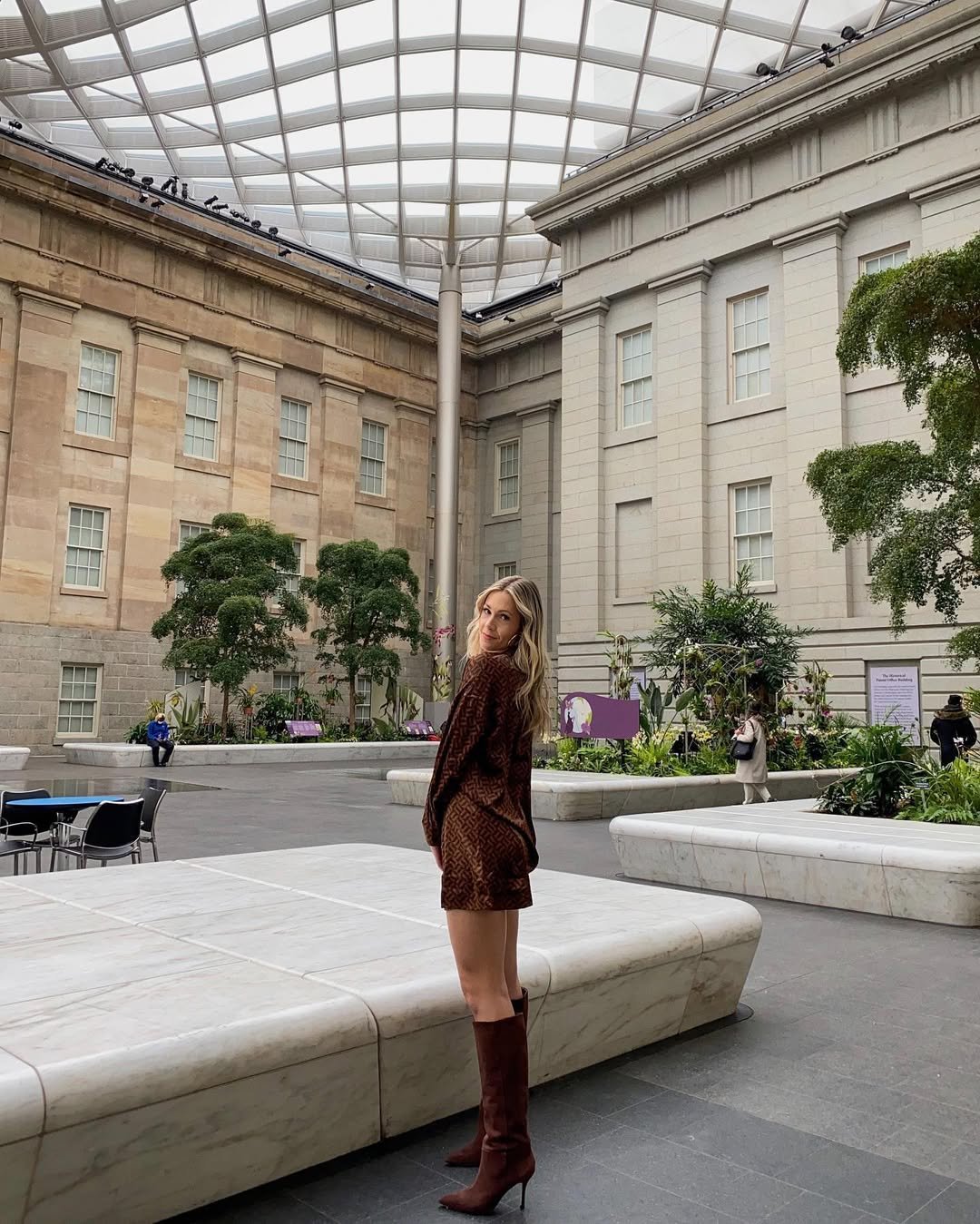 There’s something quietly stylish about this look. The textured brown dress paired with knee-high boots feels polished but still relaxed enough for a day exploring galleries.
