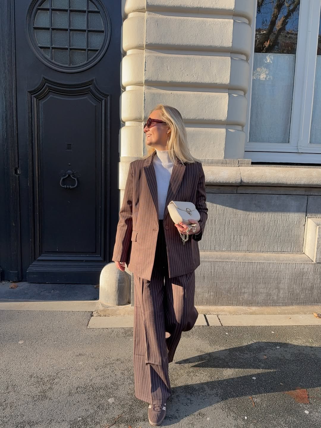 There’s a confident ease to it. Walking through golden sunlight in tailored pieces just makes the whole outfit feel effortlessly stylish.