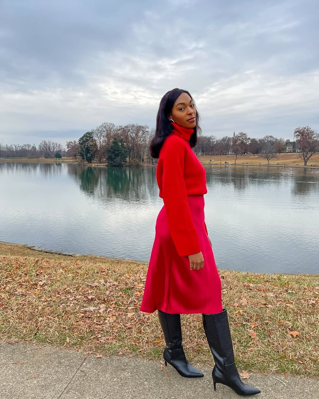 Standing beside a quiet lake, the color pops beautifully against the muted background. It’s proof that sometimes the simplest styling choice—one strong color—can make the biggest impact.