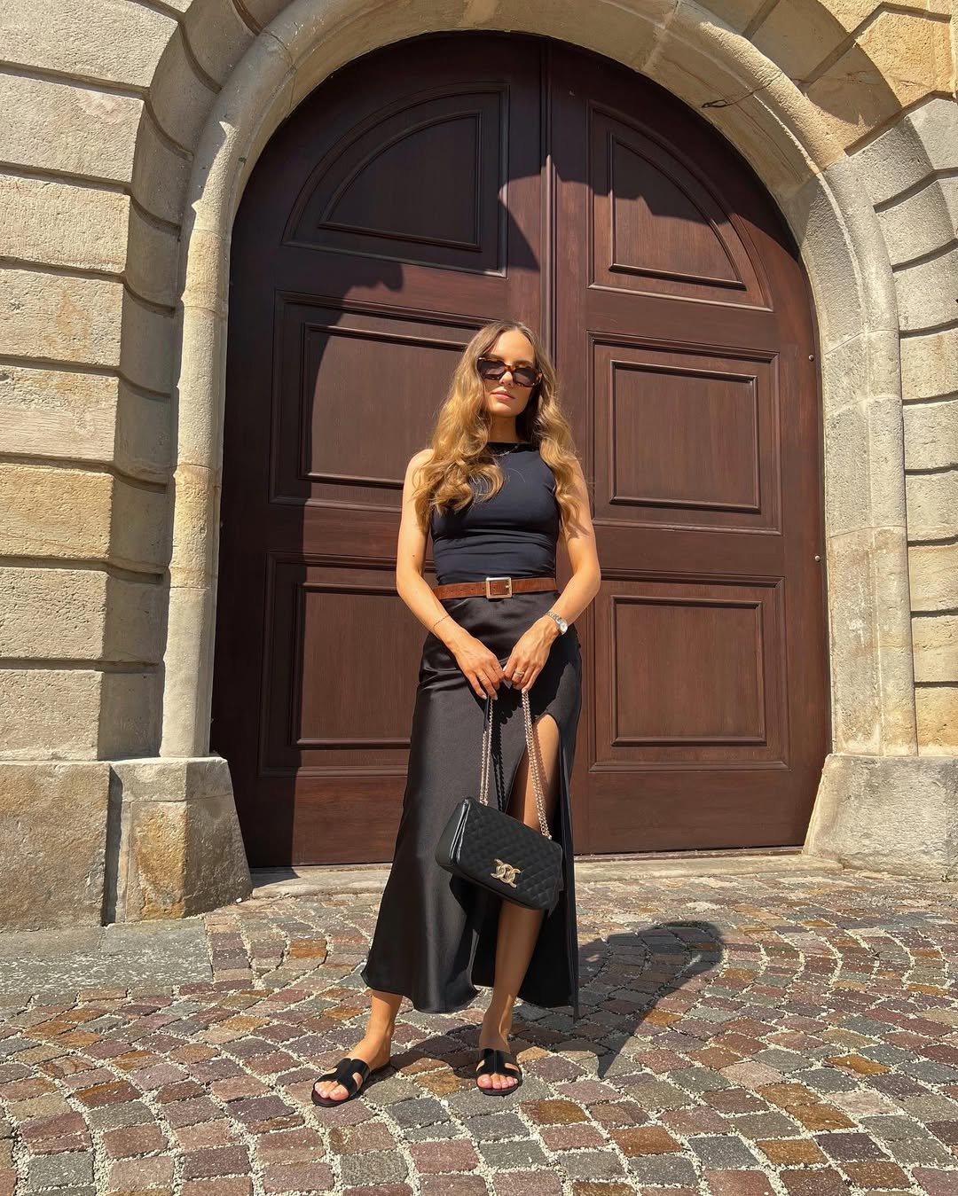 This look leans into clean elegance. The black sleeveless top paired with a silky slit skirt feels refined without being overly formal, like the perfect outfit for a warm evening out.