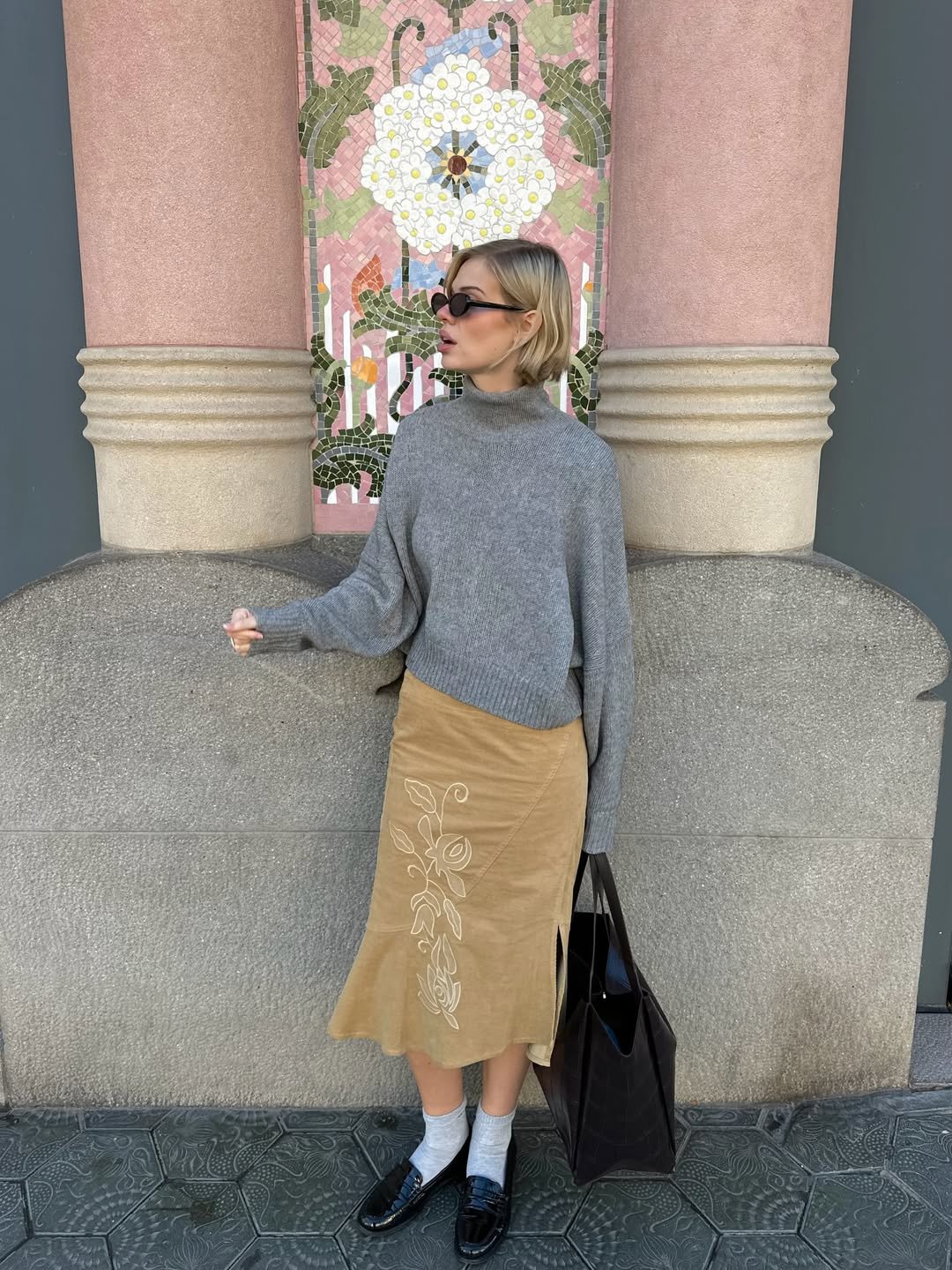 This outfit leans into calm, neutral elegance. The grey knit paired with a soft beige skirt creates a palette that feels gentle and sophisticated without trying too hard.