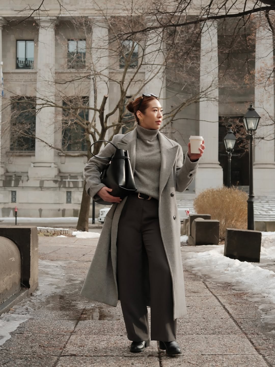 Holding a coffee while walking through the city just adds to the whole aesthetic. It’s the kind of monochrome look that feels both practical and elevated—simple pieces, styled with just enough intention.
