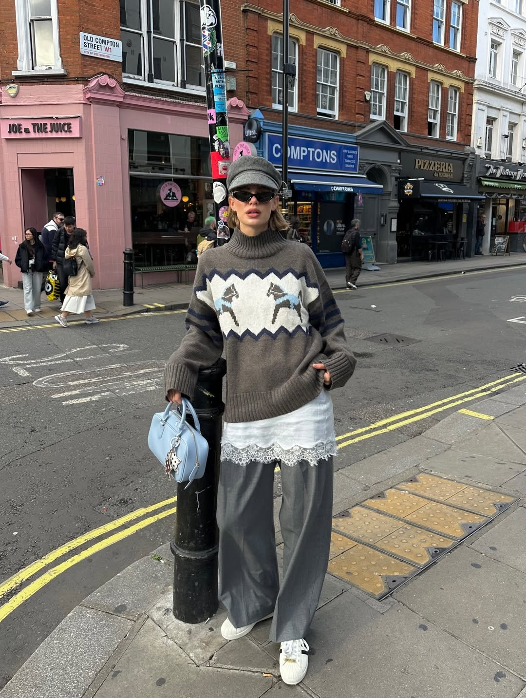 What makes it work so well is the balance. Nothing is overly styled, but together it tells a story—like someone heading out for coffee, a bookshop stop, and maybe a rainy stroll through Soho.