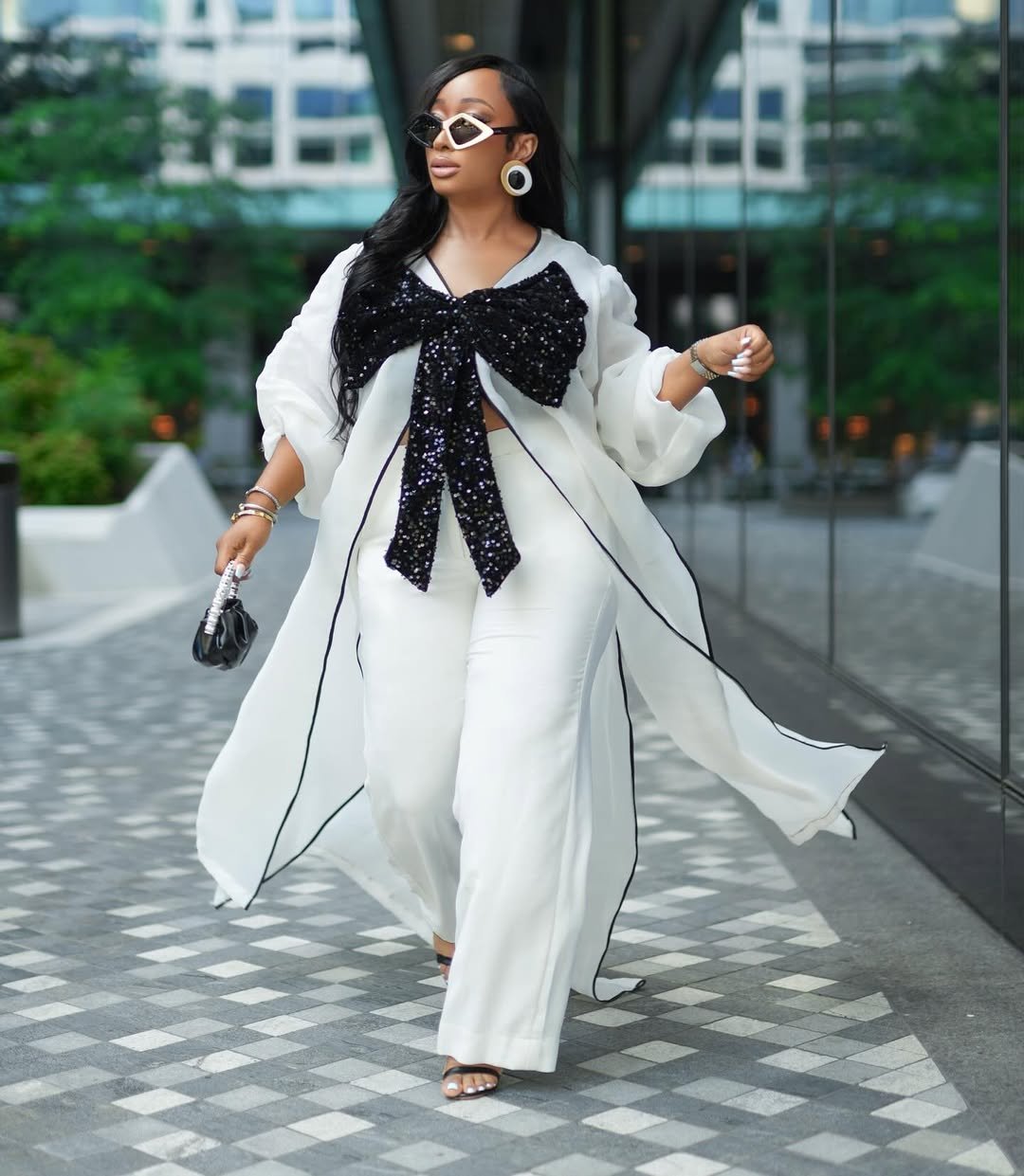 This is monochrome with a little drama—and honestly, it works beautifully. The flowing white layers paired with that oversized black sequin bow feel bold but still incredibly refined.