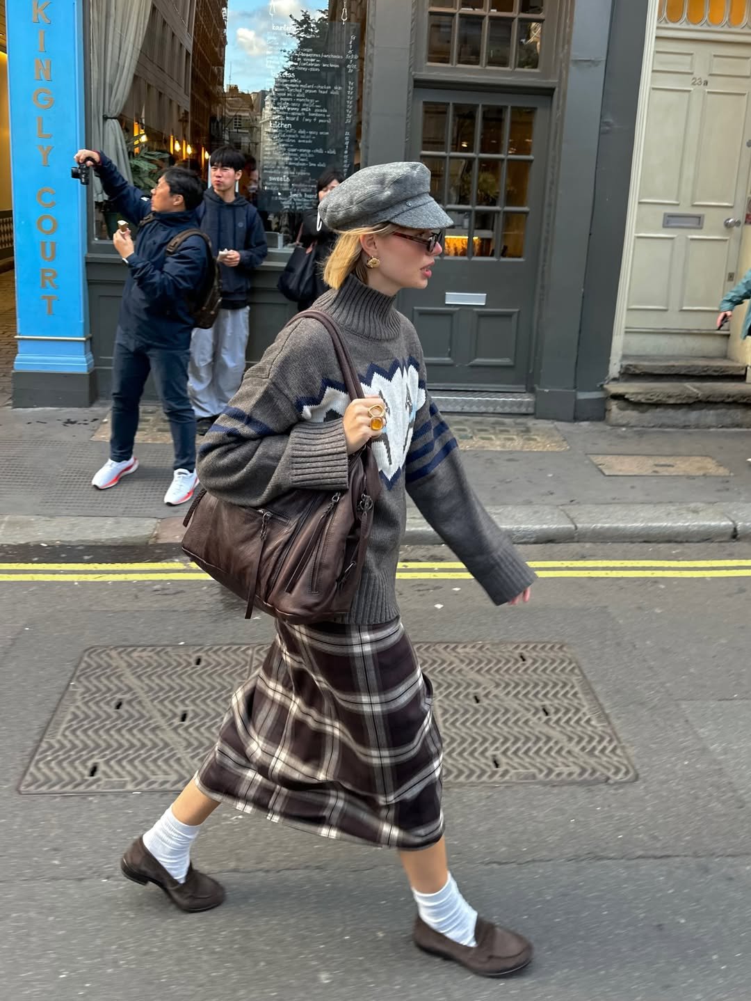 This outfit feels like it walked straight out of a charming London morning. The plaid skirt, cozy turtleneck sweater, and newsboy cap create that perfect vintage-inspired look that feels both timeless and effortlessly cool.