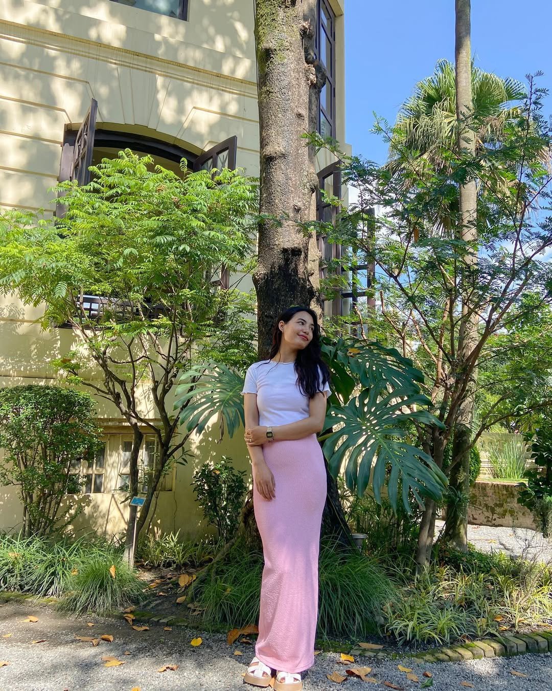This look is all about simplicity done well. A fitted white tee with a sleek pink skirt creates a silhouette that’s clean, elongating, and quietly confident.
