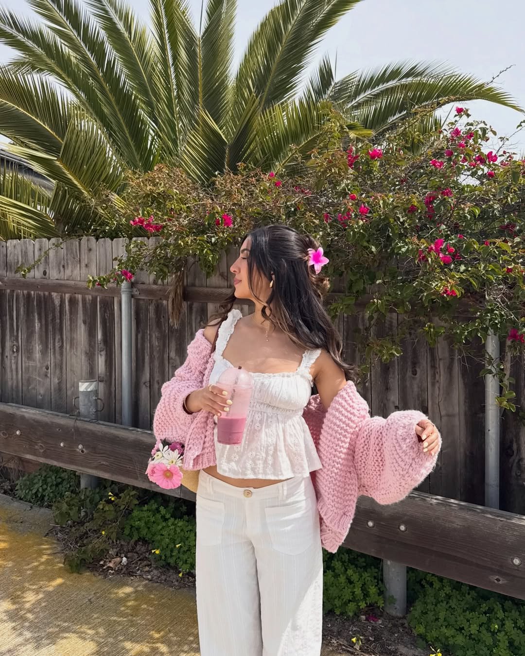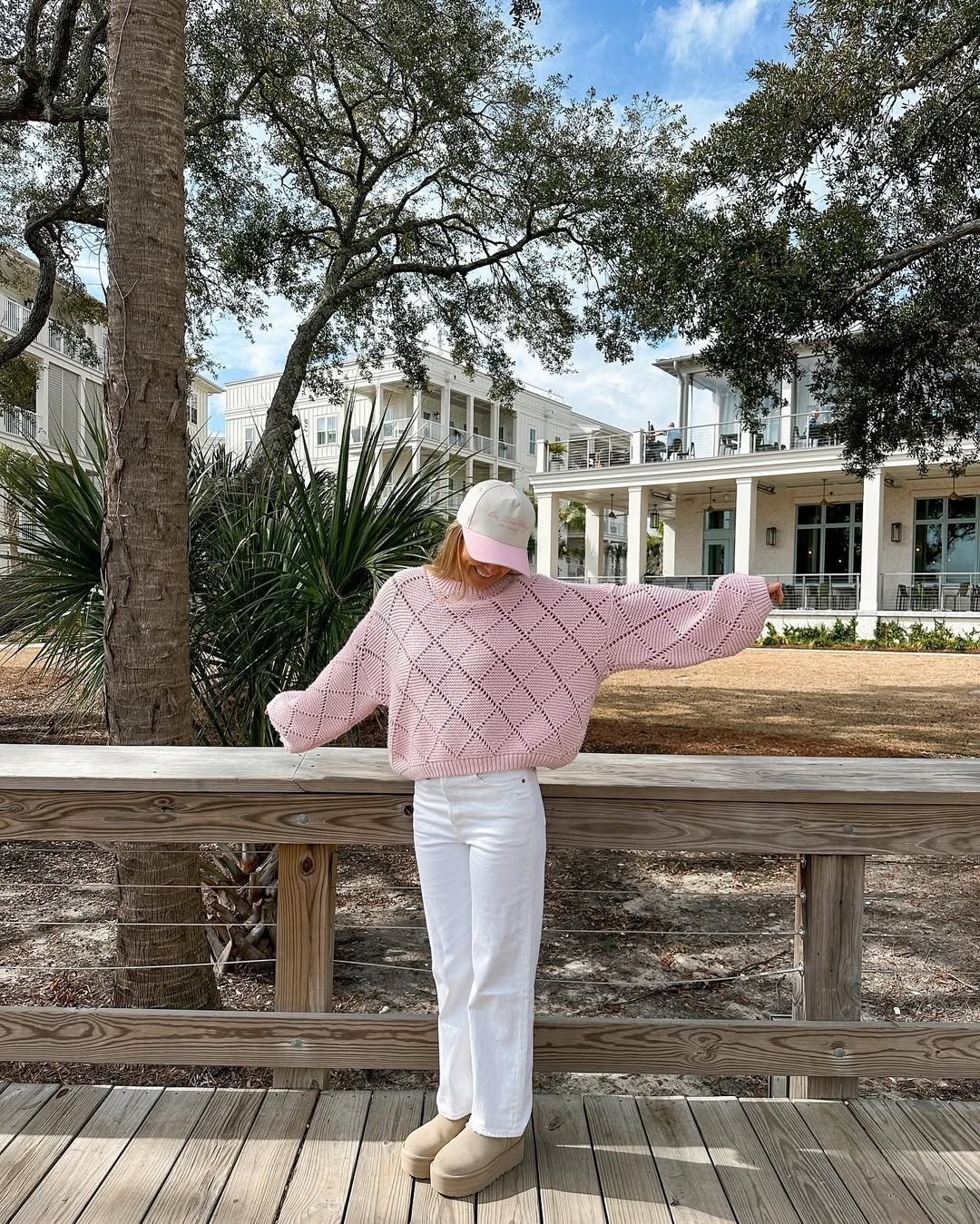 A chunky knit in soft pink paired with crisp white denim? It’s the kind of combo that never really fails. There’s a coastal, breezy feel to it that makes everything look lighter.