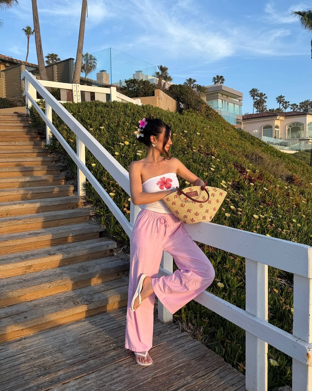 This look feels like a slow summer afternoon. The strapless top, relaxed pink pants, and those soft beachy textures—it’s calm, easy, and just a little dreamy.