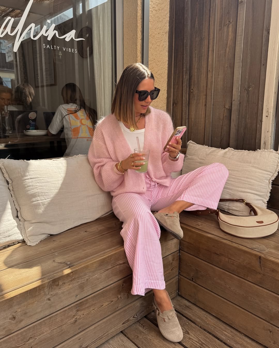 This one feels like a slow morning at your favorite café. A soft pink cardigan layered over relaxed striped pants creates that perfect mix of comfort and charm.