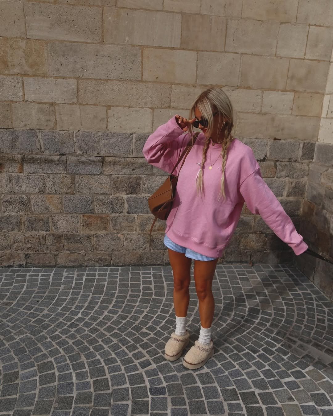 This is the kind of outfit that makes you want to slow down a little. An oversized pink sweatshirt, soft textures, and those cozy slip-ons—it’s comfort first, but still styled.