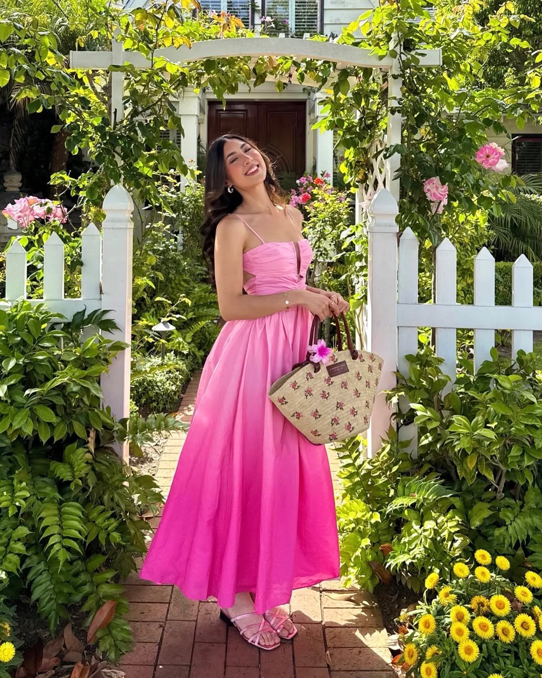 This is pure main character energy. The full pink dress, the blooming garden, the basket bag—it feels like a scene you’d want to step into.
