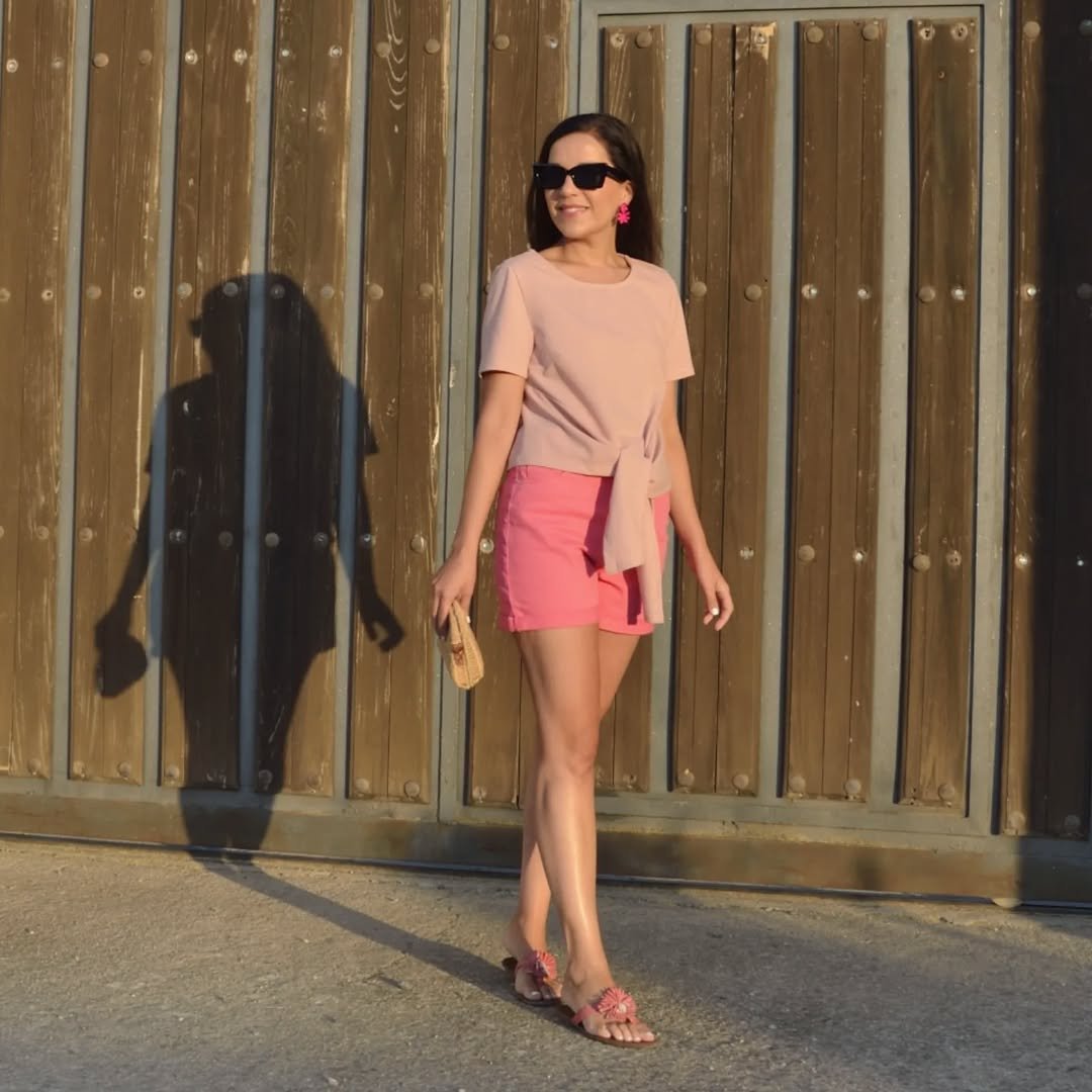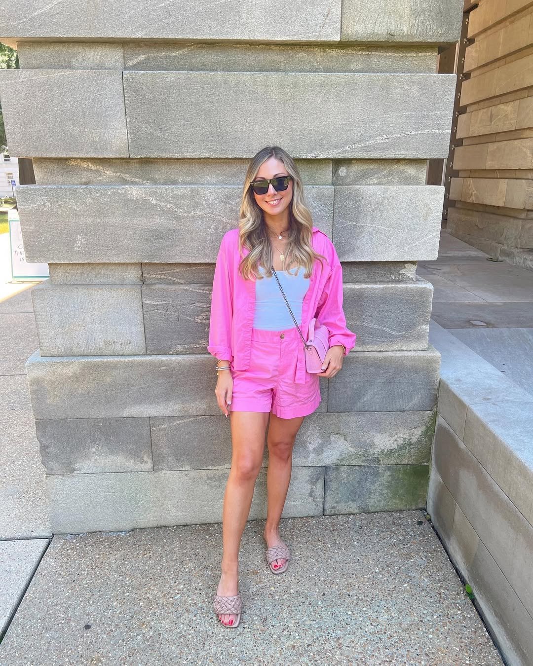 This look is pure sunshine. The matching pink shorts and shirt combo feels bold, bright, and unapologetically fun—like you planned your outfit around your mood.