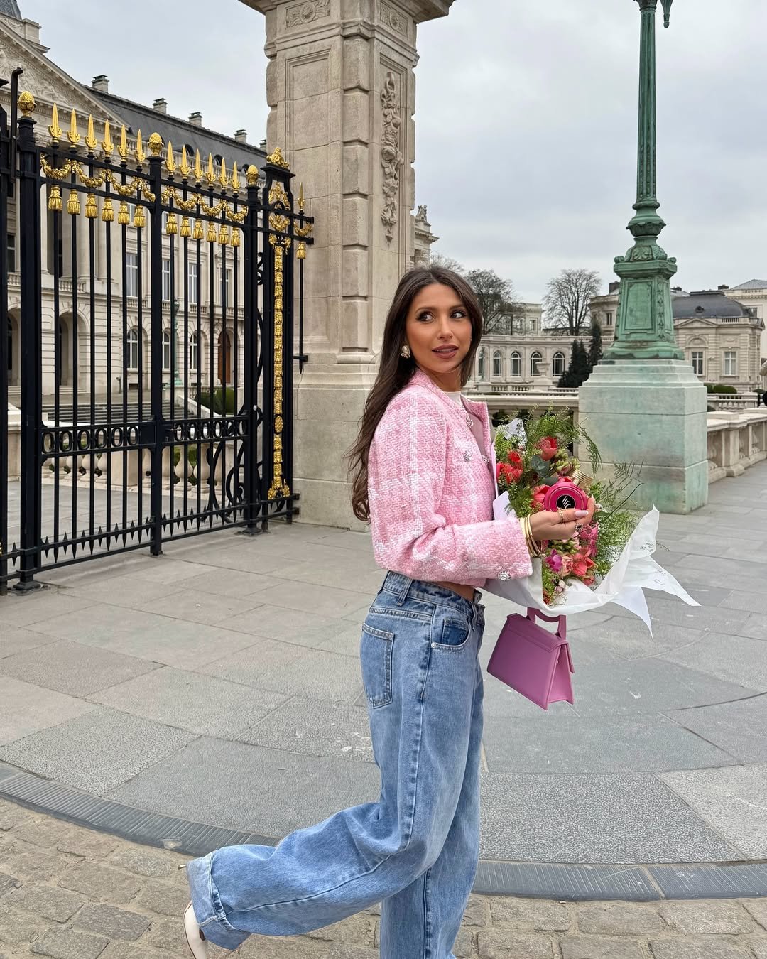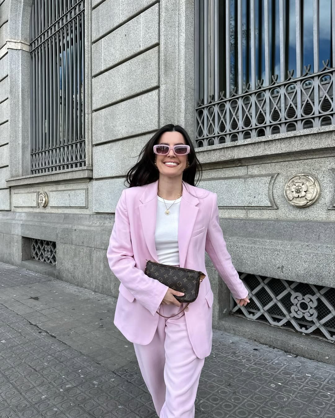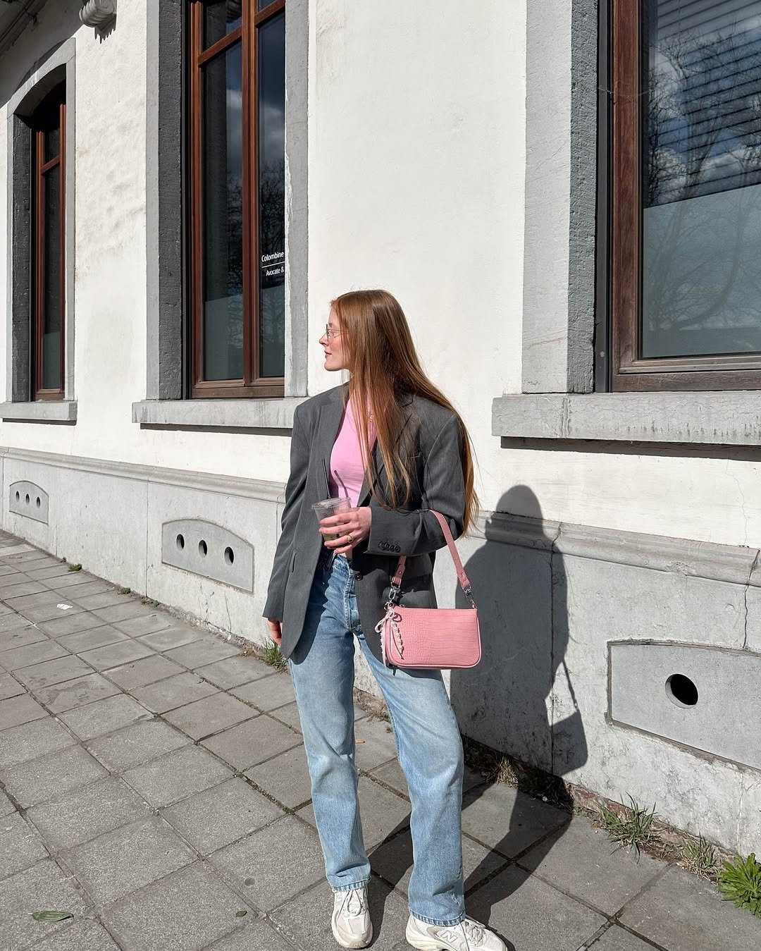 This look is proof that pink doesn’t have to be loud to make a statement. The tailored blazer layered over a tonal top feels polished, while the relaxed denim keeps it grounded and wearable.