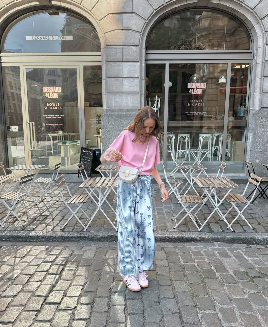 There’s something quietly chic about this look. A soft pink tee tucked into flowy striped trousers—it’s giving effortless café energy, like you just wandered out for a croissant and somehow look perfectly styled.