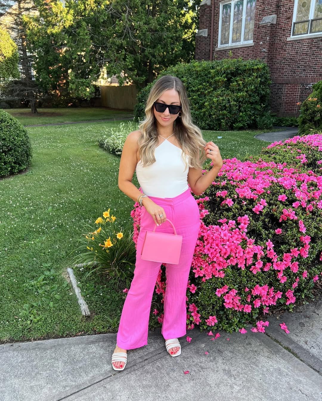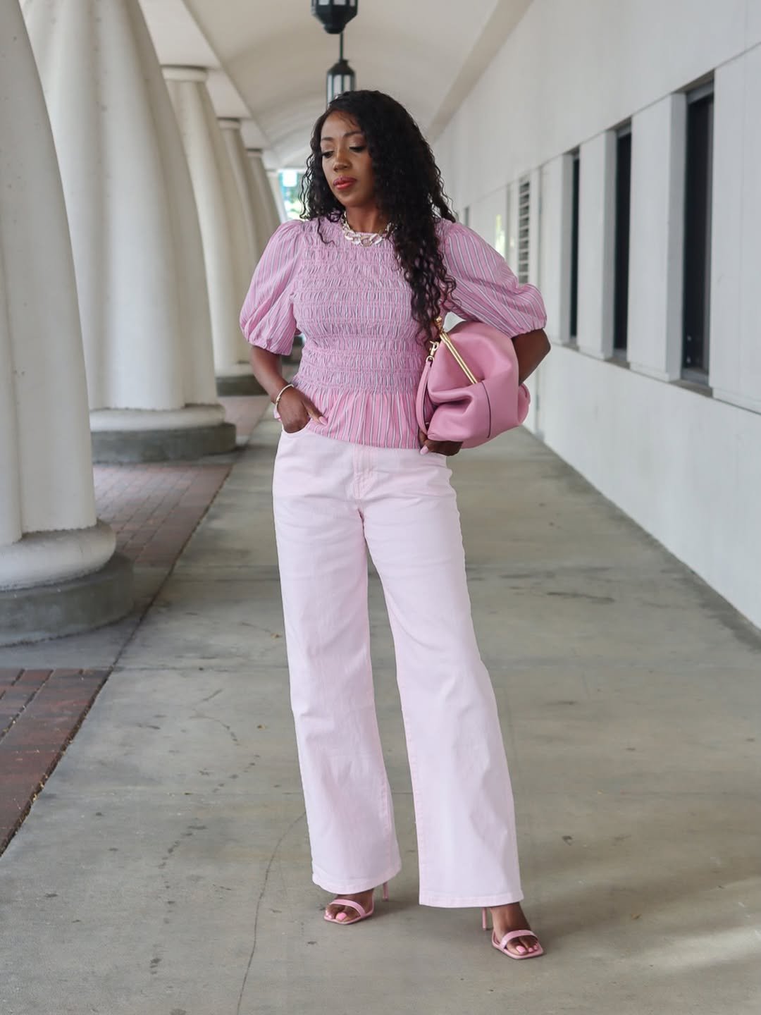 This look brings structure back into the mix. The tailored pink top with those crisp white pants feels sharp, confident, and a little bit elevated.