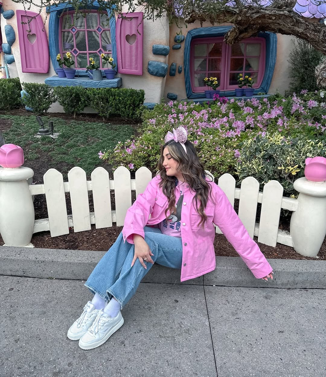 This one feels like stepping straight into a storybook. The bubblegum pink jacket, light-wash denim, and those crisp white sneakers give it that playful, almost nostalgic charm—like grown-up Disney, but cooler.