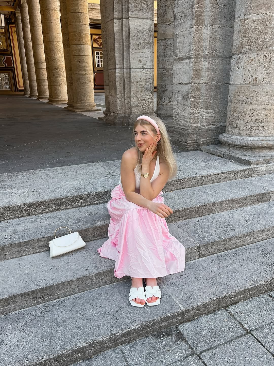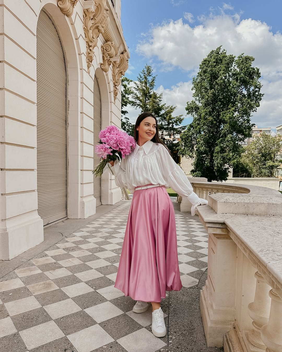 This outfit leans fully into that dreamy, feminine energy. A silky pink skirt paired with a crisp white blouse feels timeless, almost like it belongs in a European summer postcard.