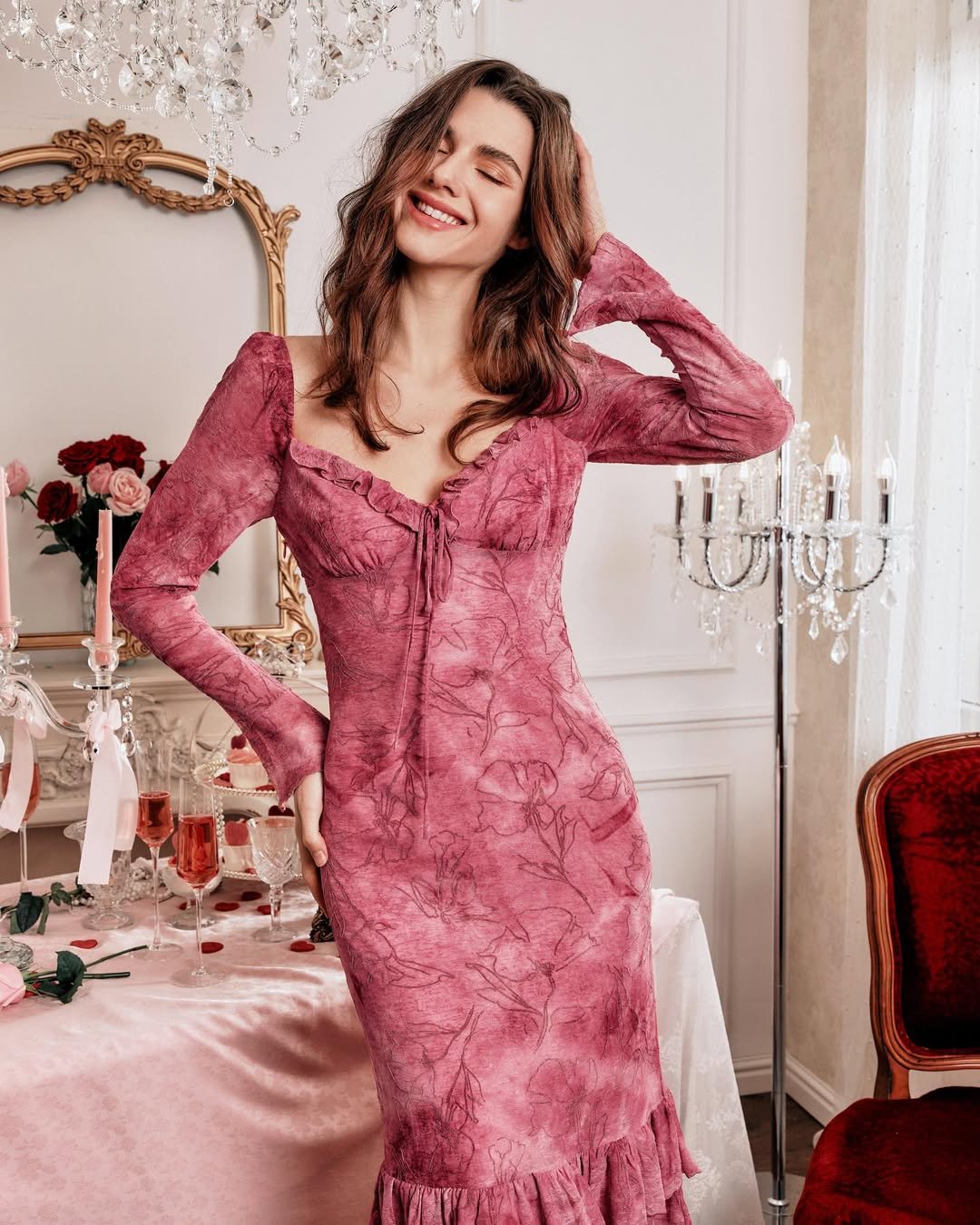 There’s a richness to this deeper pink tone that instantly elevates the look. The fitted silhouette and subtle floral texture create something that feels both romantic and a little dramatic.