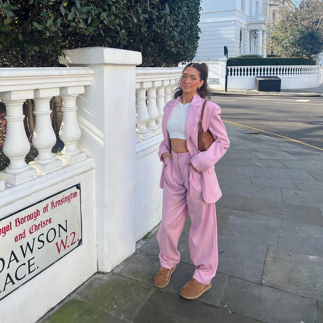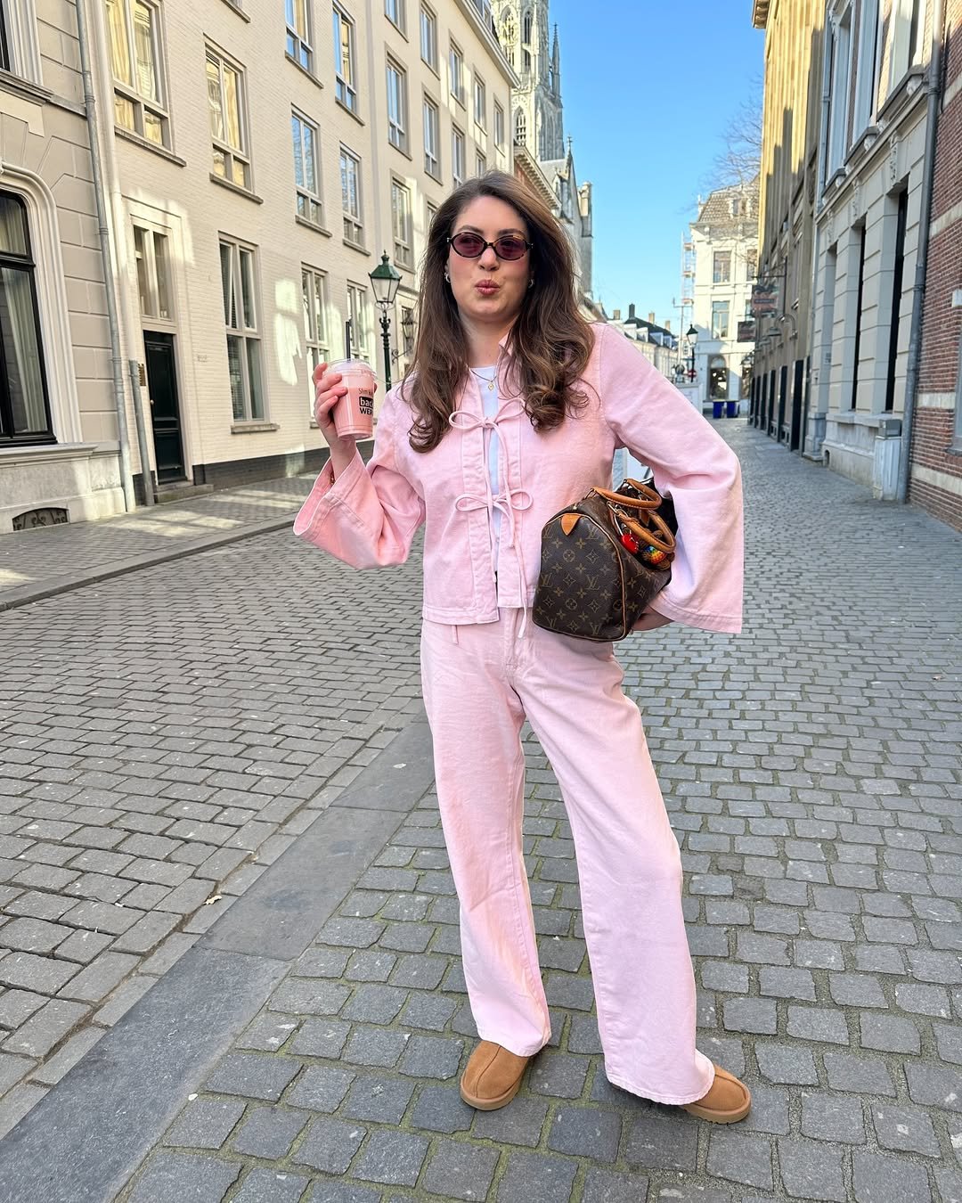 This matching pink set has that cool, slightly undone energy that makes street style so fun. The loose fit, casual stance, and statement bag all come together in a way that feels natural, not forced.