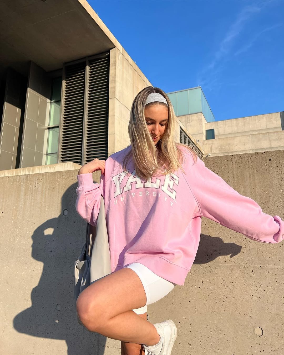 This outfit leans into playful comfort with zero hesitation. The oversized pink sweatshirt paired with biker shorts feels sporty, casual, and just a little bit nostalgic.
