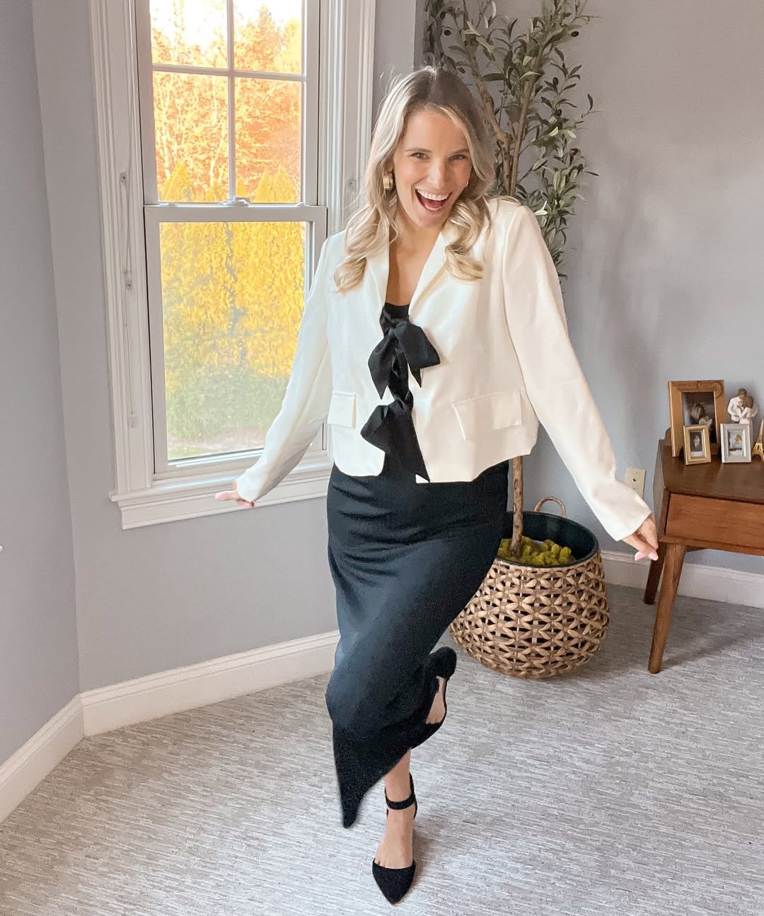 Caroline is giving us classic holiday elegance, but make it fun. The white jacket with a bold black bow is peak modern hostess energy. It’s timeless without being stuffy and says, “I might offer you spiked eggnog, but I also baked the cookies from scratch.” Paired with a sleek black maxi skirt and ankle-strap heels, this look is a masterclass in monochrome magic.
