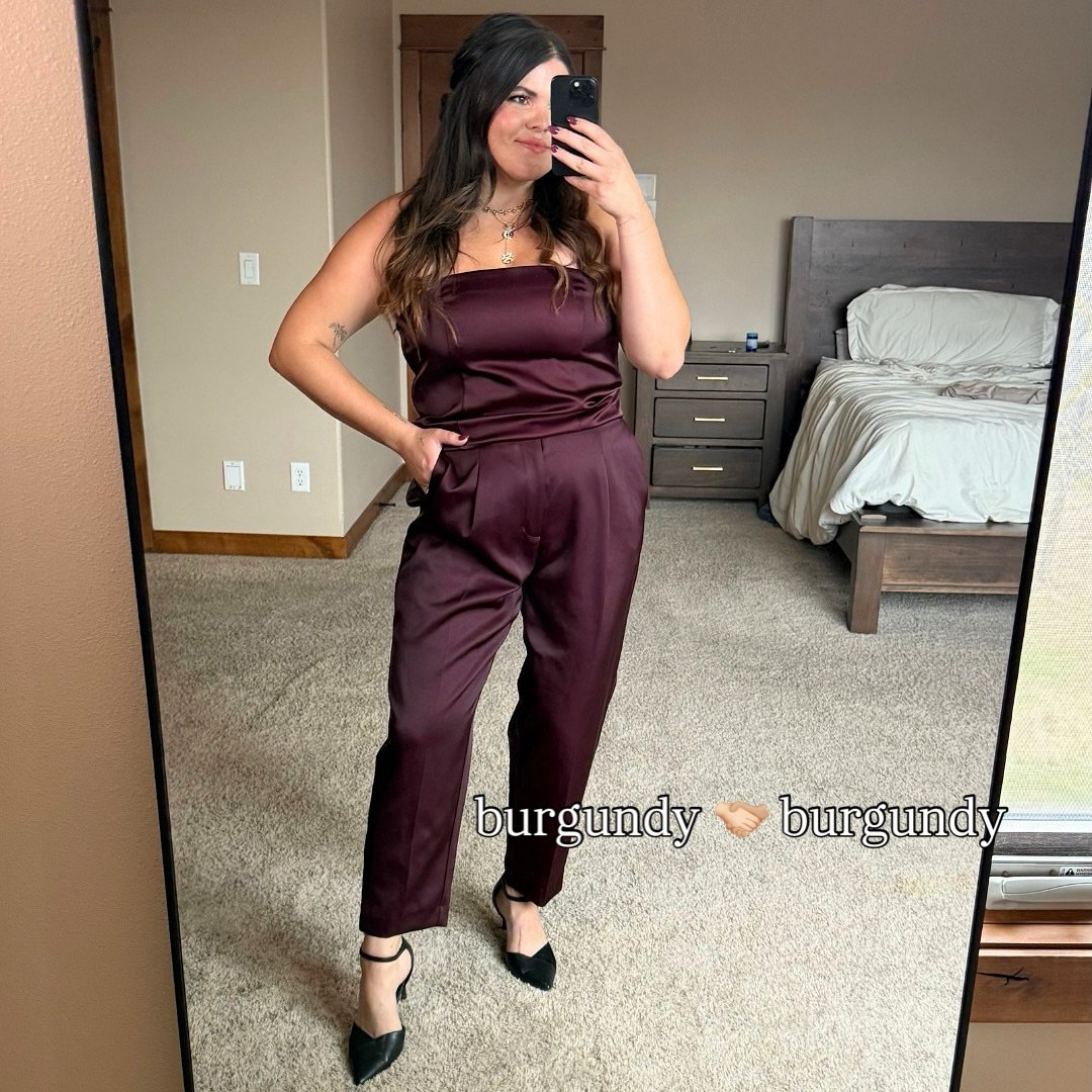 Now this is how you do monochrome maternity style. Erica goes full burgundy in a silky jumpsuit that drapes like a dream. The strapless neckline adds a touch of sophistication, and the matching heels make it feel luxe. It’s not over-accessorized, which lets the texture and tone do the heavy lifting—and honestly? They’re doing a great job.