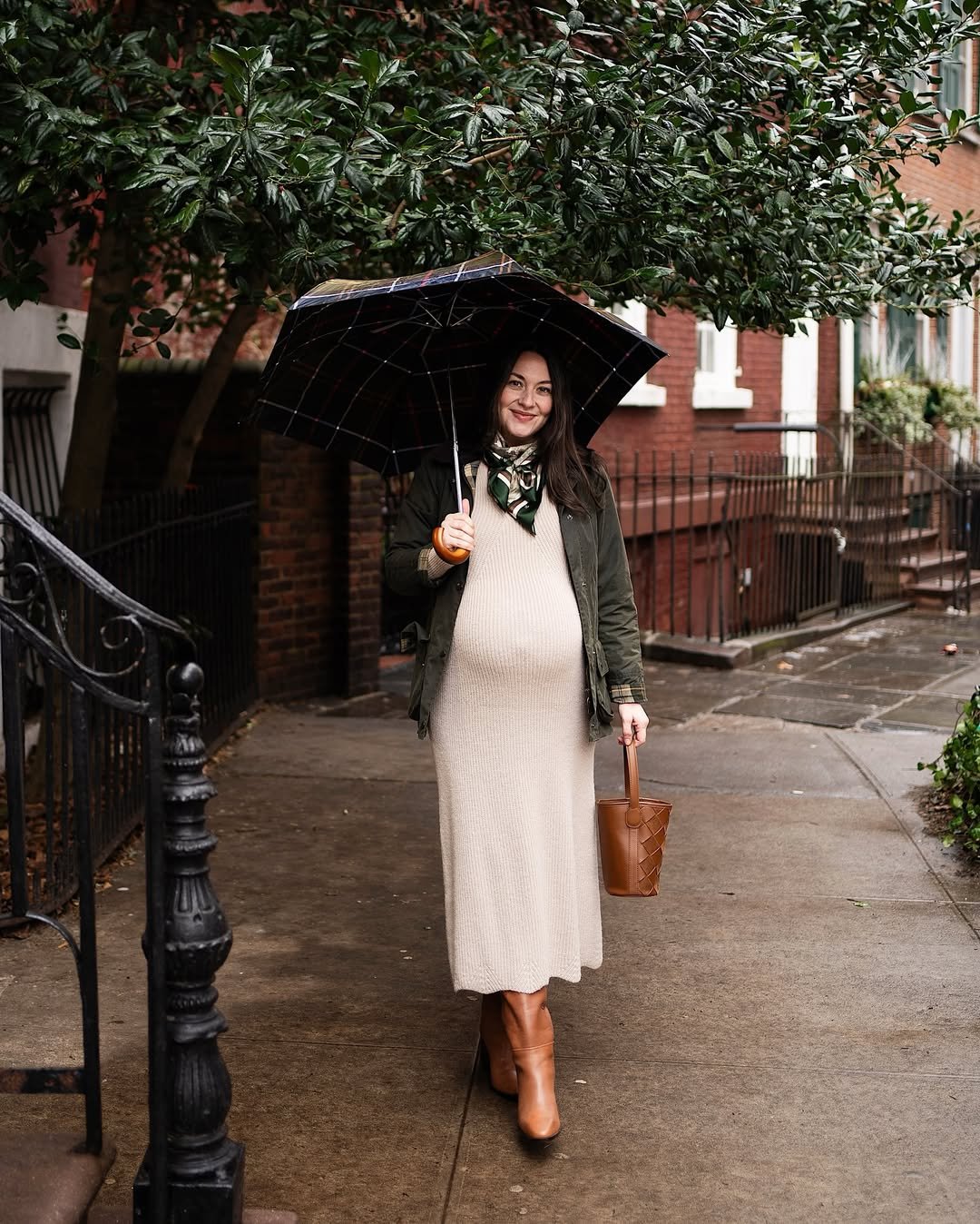 This is how you do rainy-day maternity glam. Carly strolls down a city sidewalk looking like a Christmas card come to life. The cozy knit dress hugs her bump beautifully, while the olive green coat and printed scarf add just enough texture to elevate the whole look. And let’s not ignore that leather bucket bag—it’s giving vintage market treasure in the best way.