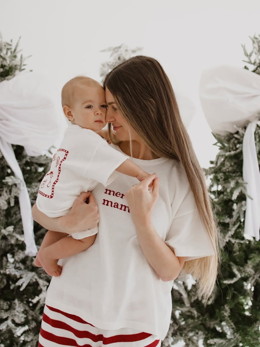 This photo is giving all the warm fuzzies—literally. Matching festive PJs? Check. A baby snug in mama’s arms? Double check. And the backdrop of frosted trees wrapped in white bows makes this moment feel like it was pulled straight out of a Hallmark holiday special (the good kind, not the cheesy kind). The “merry mama” tee keeps it playful but intentional, like a little nod to motherhood magic during the season.