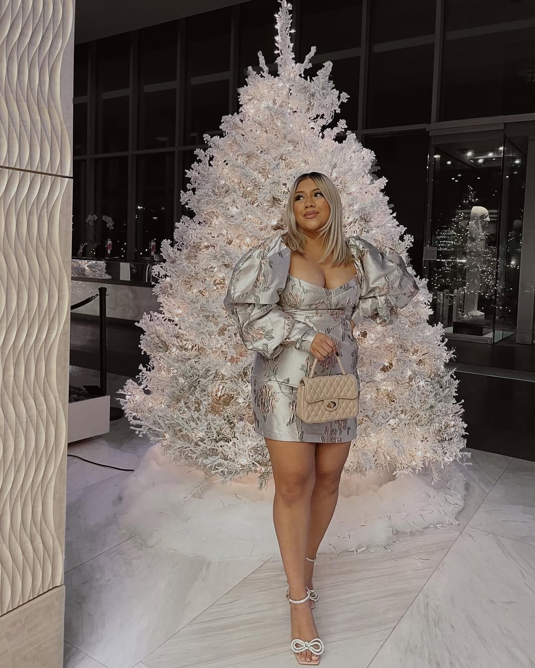Who says maternity style can’t be high fashion? StyledItxGemma said “watch this” and delivered a full-on winter fantasy. The puff-sleeved, metallic silver mini dress is pure drama, and the matching heels and Chanel bag? Frosted perfection. That tree may be the centerpiece, but she’s the main character.