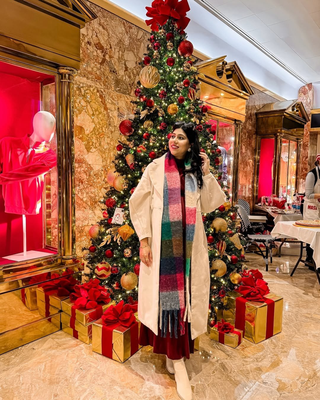 There’s holiday dressing—and then there’s holiday dressing at The Plaza. Jagriti looks like she stepped out of a festive fashion editorial. The cream coat is plush perfection, paired with a jewel-toned scarf that adds color without chaos. Her red velvet dress peeks through just enough to say, “Yes, I came to slay.”