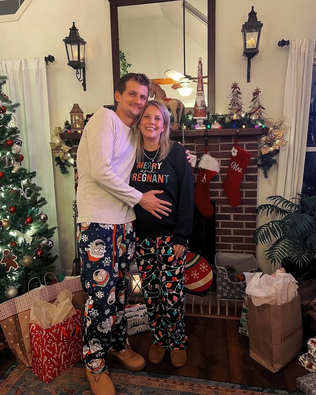 Talk about commitment to the Christmas theme. Simply Katherine and her partner went full festive—her black sweater spelling out “Merry and Pregnant” (we love a literal moment), paired with string-light print pants that honestly kind of slay.