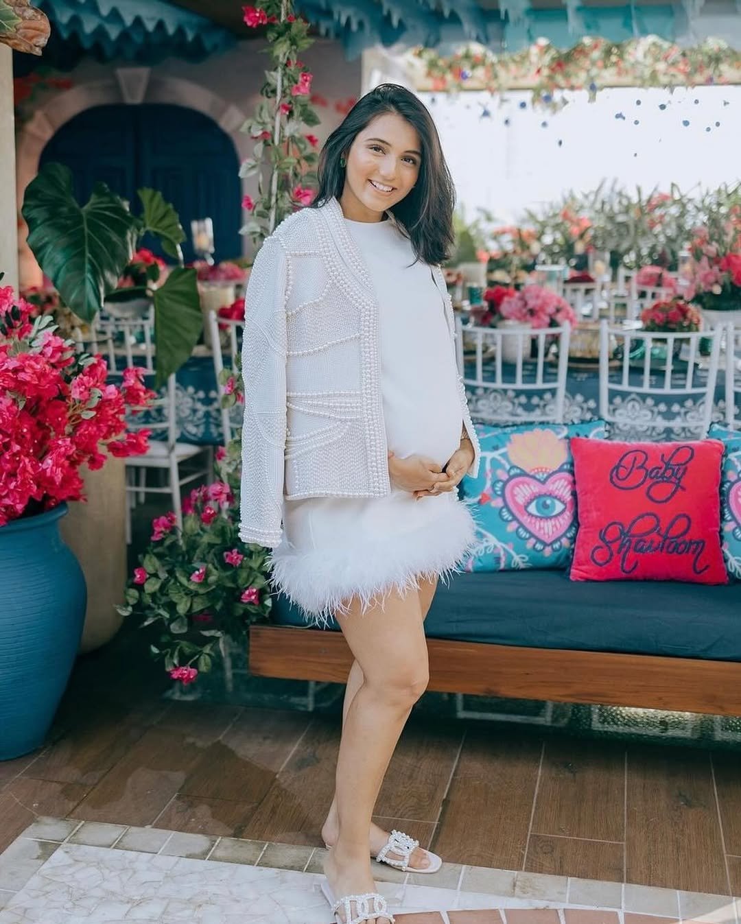 This look is practically singing “let’s celebrate!”—and honestly, it should. Masoom brings effortless elegance in a white-on-white ensemble with playful feather trim, a statement pearl jacket, and those embellished sandals that deserve their own spotlight. It’s luxe, but not fussy. Glamorous, but not loud. The whole setup—with floral bursts, velvet seating, and a “Baby Shawtoon” pillow—is peak curated charm.