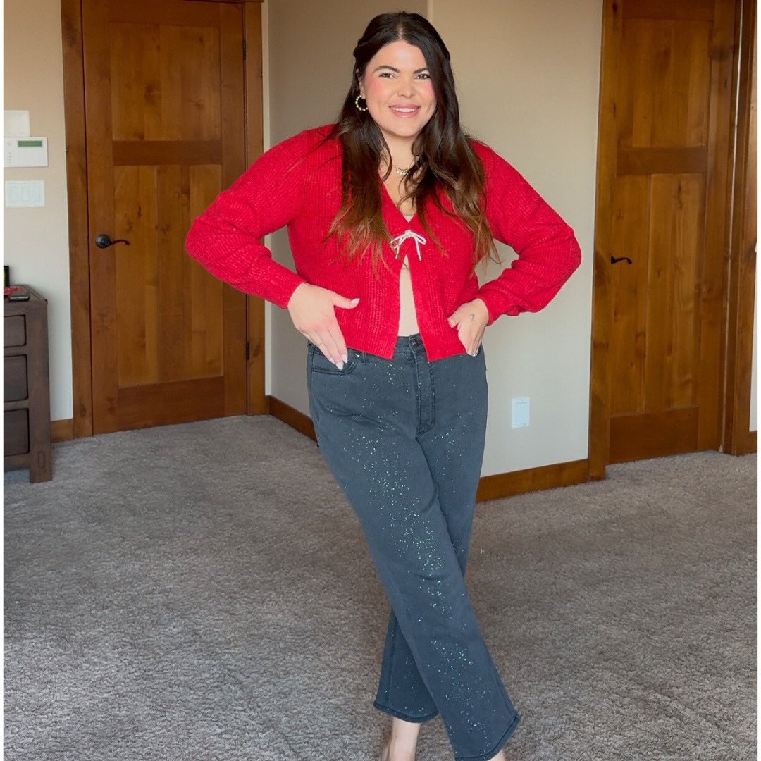 Red cardigan. Glittery black jeans. Joy on her face. This look is simple, cute, and totally doable—exactly what we want from casual Christmas fashion. Erica’s red knit is the main character here: cozy, flattering, and perfectly festive. It pairs so well with the subtle sparkle on her jeans—just enough dazzle to say “yes, I understood the assignment.”