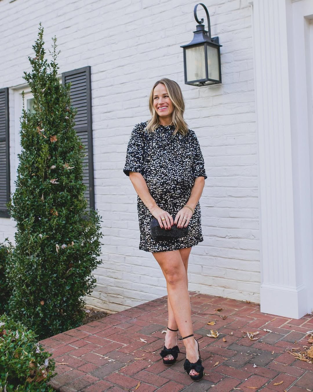 Teri Lyn is giving us sequin realness with this black-and-white speckled mini dress that dances in the light. It’s short, it’s swingy, and it shows off the bump without clinging. The loose waves and platform sandals balance out the sparkle, keeping it elevated but wearable.