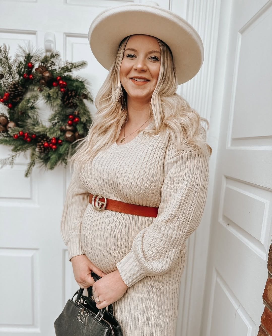 Let’s take a moment for the textures here. The ribbed knit dress from Pink Blush is soft, form-fitting, and just enough glam with that bold red Gucci belt cinched above the bump. And that hat? A whole vibe. It’s giving modern prairie meets city brunch.