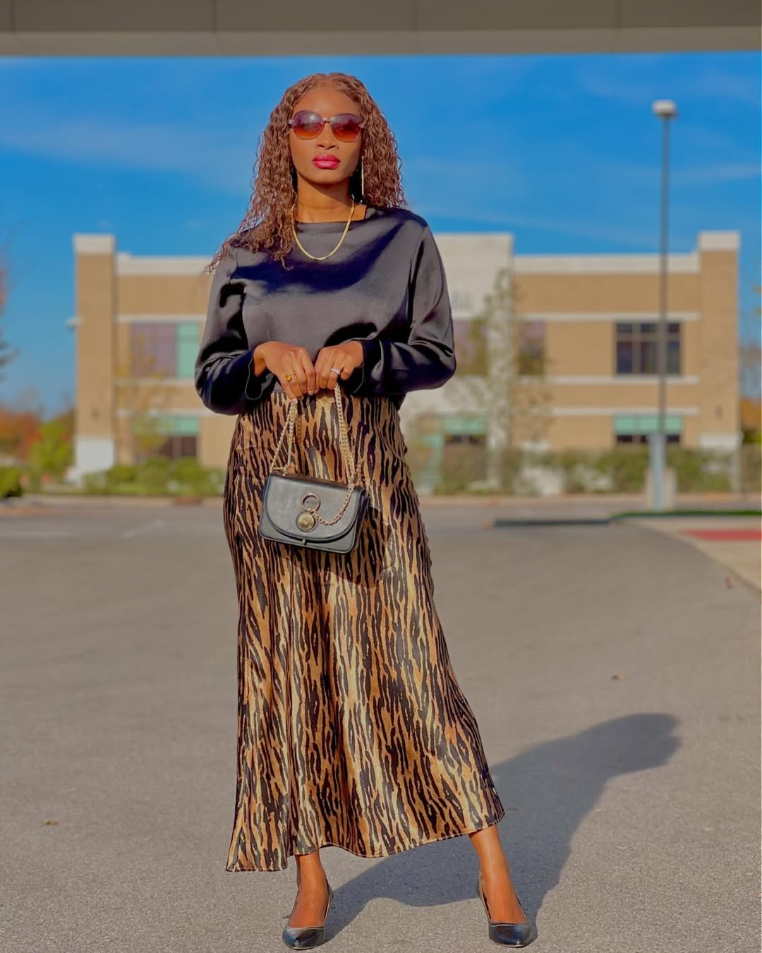 There’s a strong presence to this look that you can’t ignore. The sleek black top lets the tiger-print skirt take center stage, bringing movement and personality into every step.