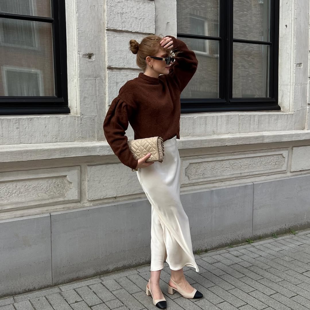 This outfit feels like autumn wrapped into a look. The rich brown sweater paired with a creamy satin skirt creates a warm palette that feels instantly sophisticated.