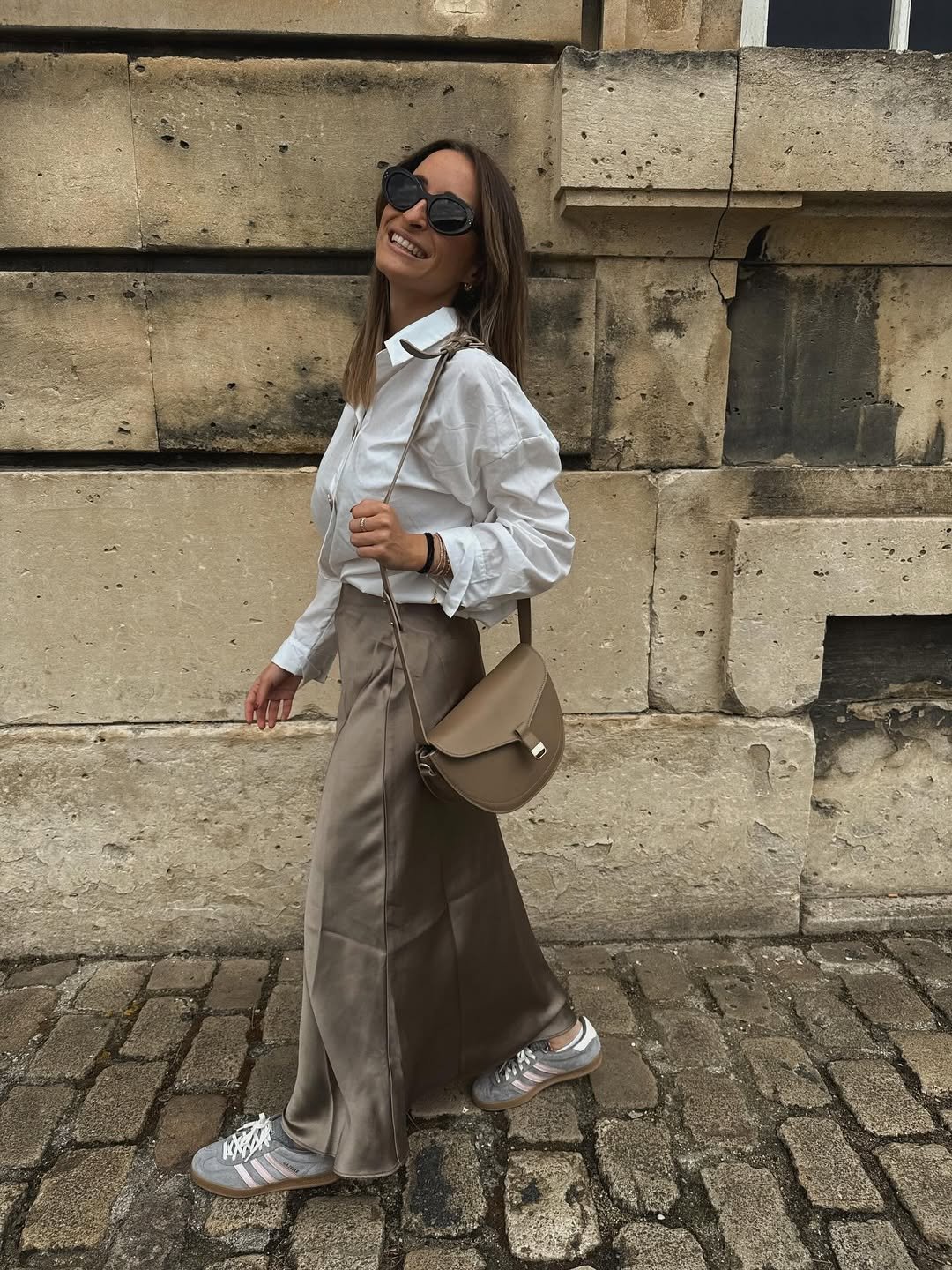 This outfit leans into clean, tailored lines but keeps things relaxed. A crisp white shirt tucked into a silky taupe skirt creates a soft structure that feels easy to wear.