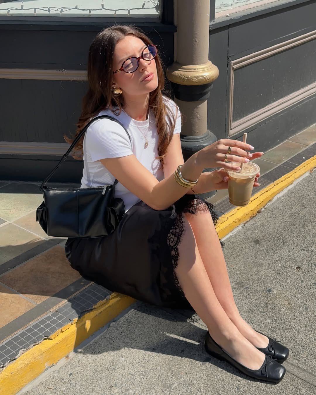 This look feels like a slow afternoon in the sun, iced coffee in hand and nowhere urgent to be. A simple white tee meets a black lace-trim skirt, striking that balance between casual and softly feminine.