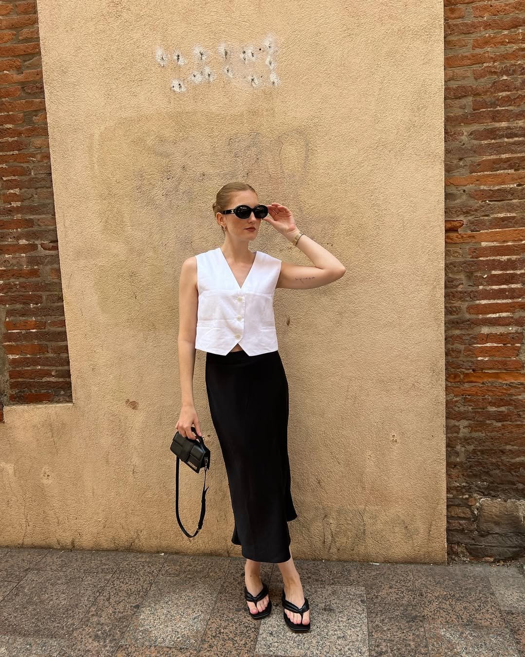 There’s a lovely sense of balance in this outfit. The structured white vest adds sharpness while the silky black skirt brings that soft, fluid movement.