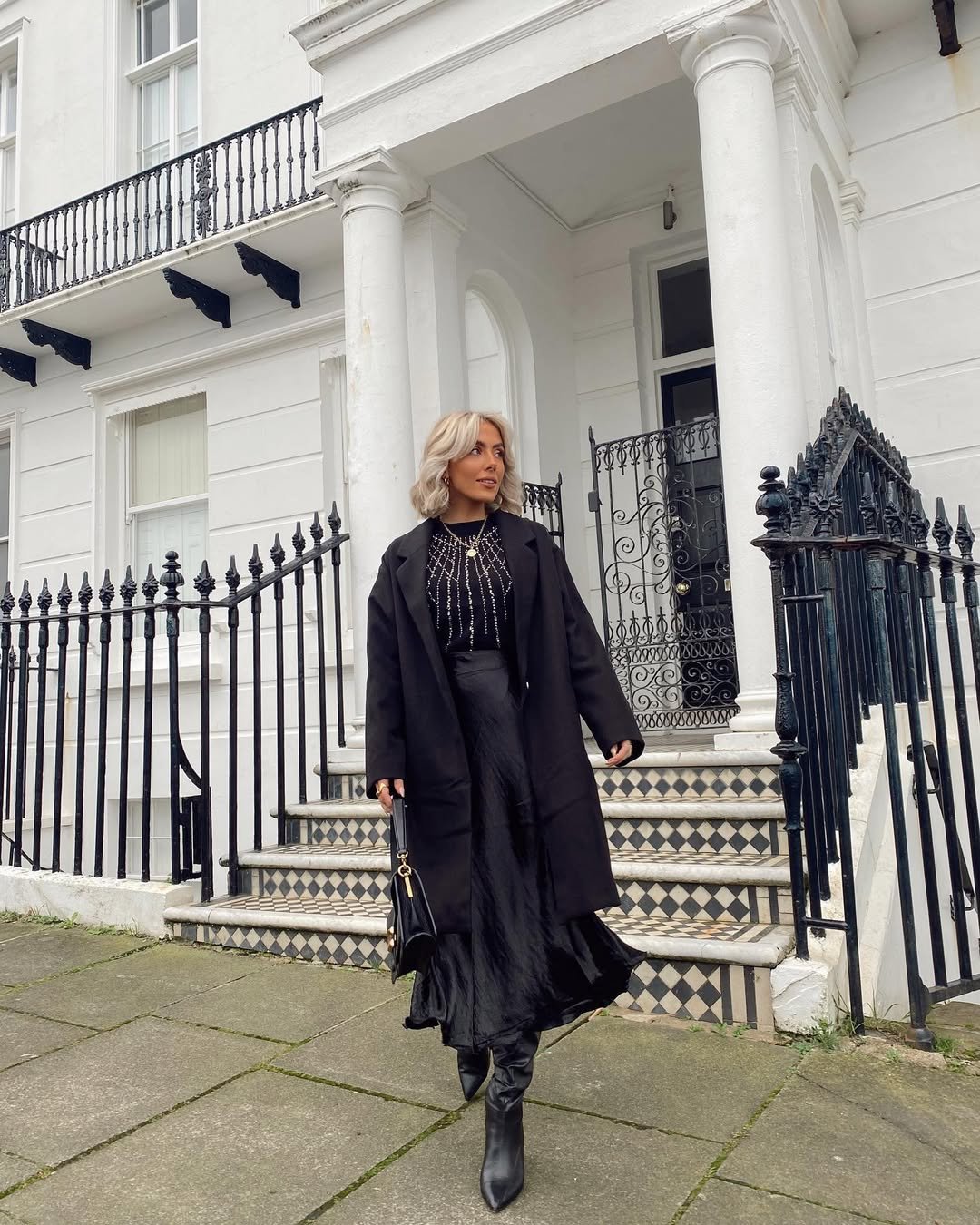 This outfit leans fully into dramatic elegance. The flowing black satin skirt paired with a long tailored coat creates a silhouette that feels strong, confident, and beautifully styled.