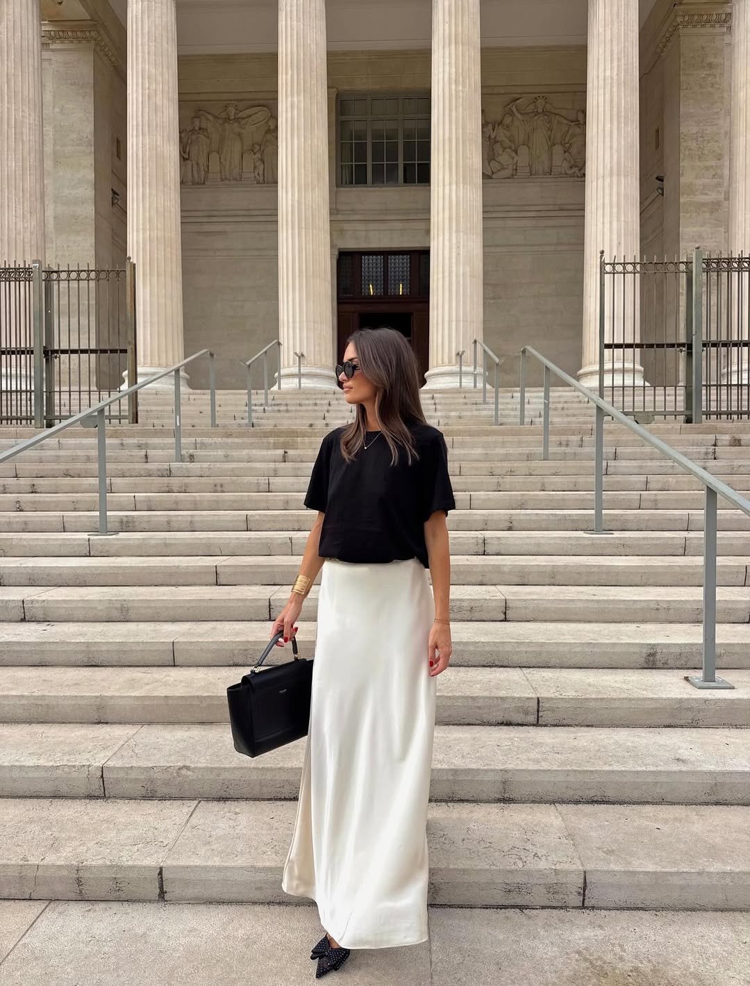This outfit keeps things beautifully minimal. A simple black tee paired with a flowing ivory satin skirt creates that clean contrast that always feels timeless.