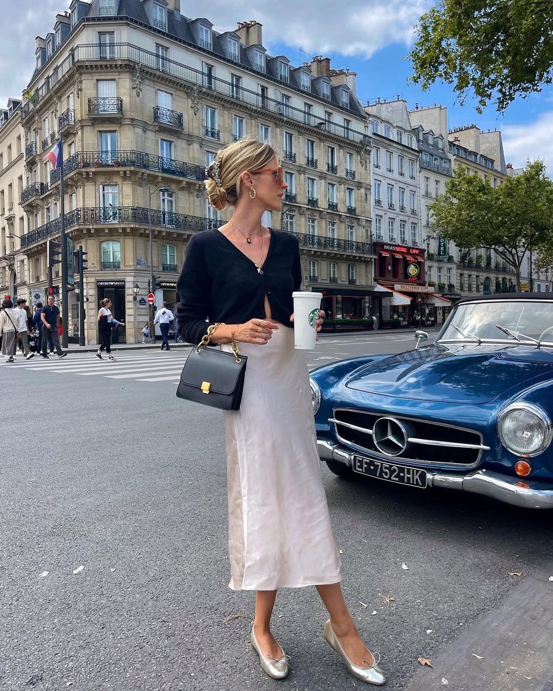 This look feels like a snapshot of everyday elegance. A black cardigan worn simply over a satin skirt creates that understated silhouette French style does so well.
