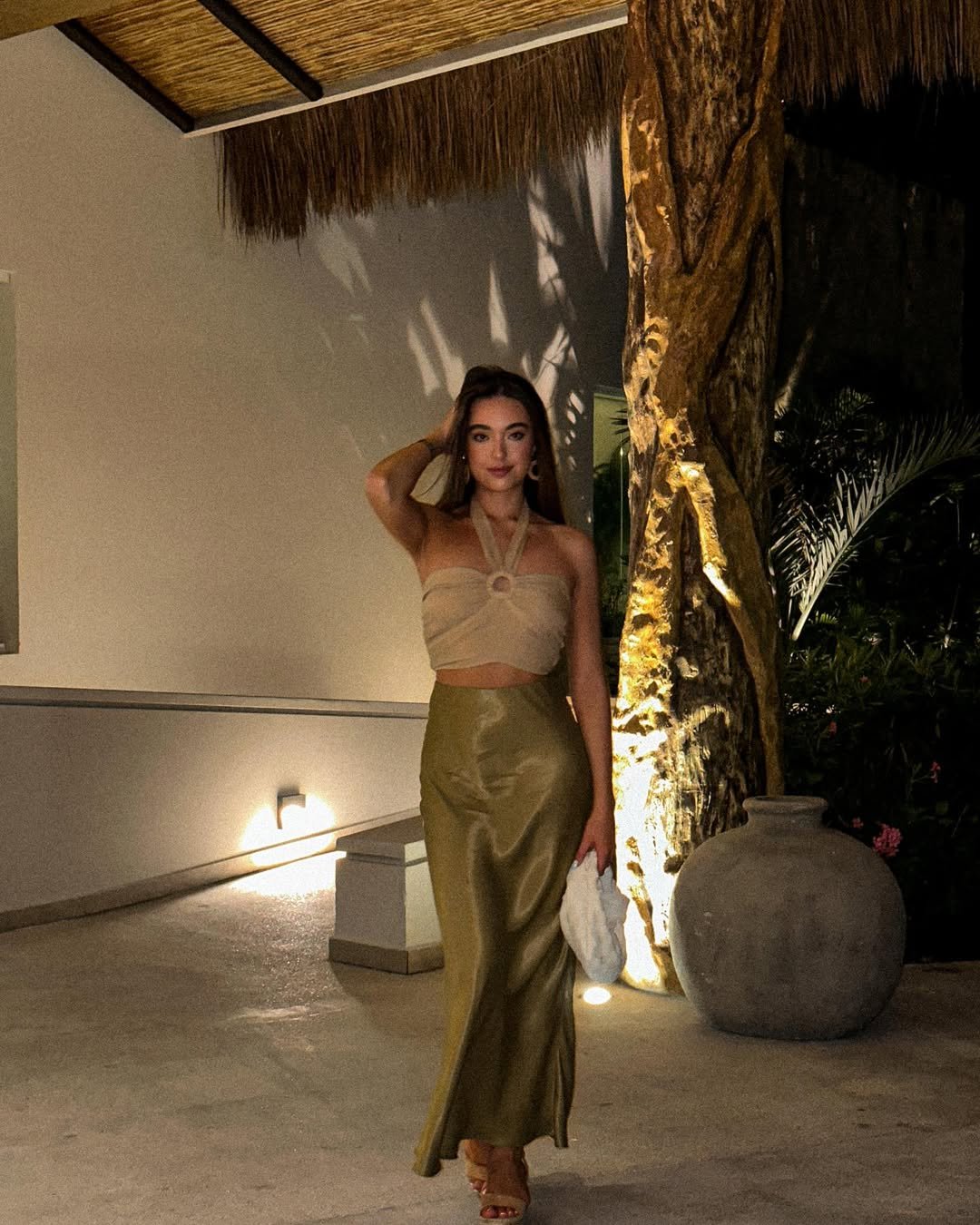 There’s a softness here that feels almost cinematic. The silky olive skirt catches the light beautifully, paired with a minimal bandeau top that keeps the look clean and focused.